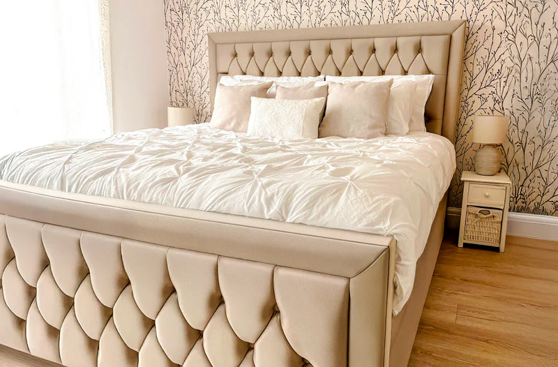 The Vetra Side Panel Bed by Somni Beds is designed to bring quiet structure into modern bedrooms. With its tall vertical panel detailing and softly upholstered frame, it adds height, rhythm, and elegance while remaining calm and inviting.